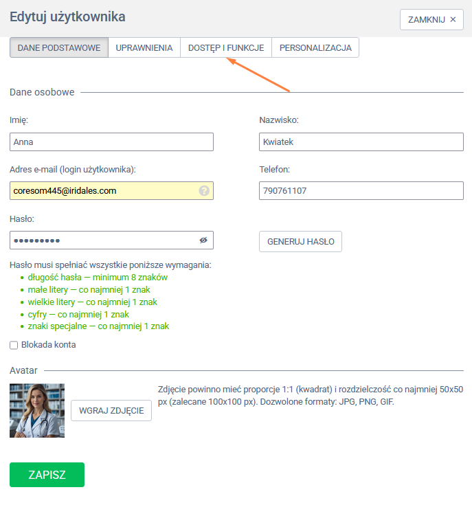 3. Przejdź do zakładki „Dostęp i funkcje”.