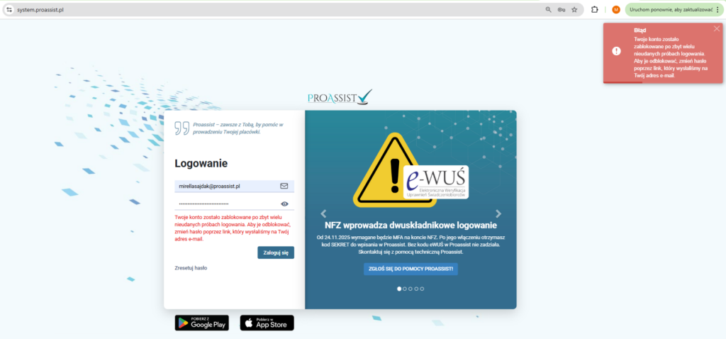 Aby chronić konta użytkowników przed nieautoryzowanym dostępem oraz próbami odgadnięcia hasła, system Proassist stosuje mechanizm automatycznej blokady konta po zbyt wielu błędnych próbach logowania.