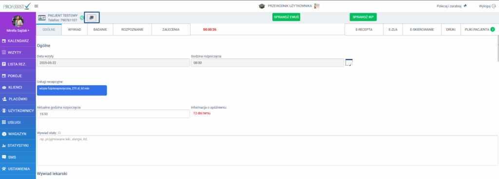 - Z prawej strony ekranu wysunie się panel czatu, w którym możesz rozpocząć rozmowę SMS z pacjentem.