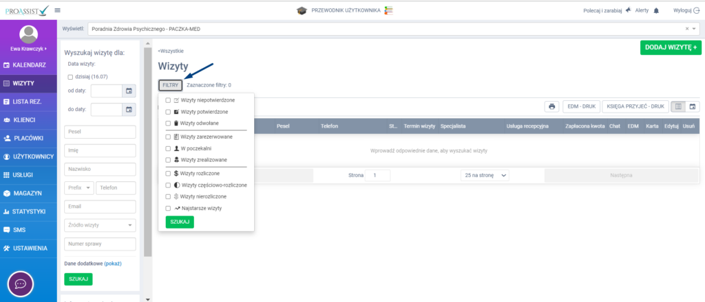 Jeżeli chcesz włączyć filtry w zakładce wizyty, w tym celu przejdź do zakładki WIZYTY z bocznego menu, a następnie wybierz zakładkę FILTRY. Z listy rozwijanej wybierz odpowiedni status wizyty, a następnie SZUKAJ.