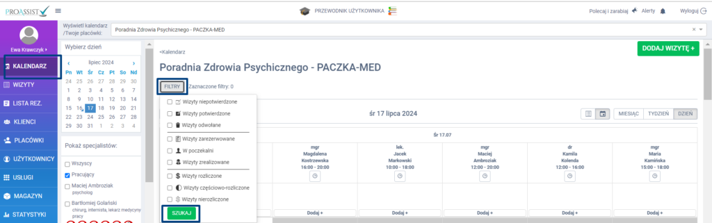 Jeśli natomiast chcesz włączyć filtrowanie w zakładce KALENDARZ, kliknij nad siatką kalendarzową w biały przycisk FILTRY i zaznacz odpowiedni checkbox przy danym statusie, w zależności od tego, które wizyty chcesz zobaczyć: potwierdzone, niepotwierdzone, odwołane, w poczekalni, zarezerwowane, zrealizowane, rozliczone, częściowo rozliczone, nierozliczone. Po dokonaniu odpowiedniego wyboru kliknij w zakładkę SZUKAJ.