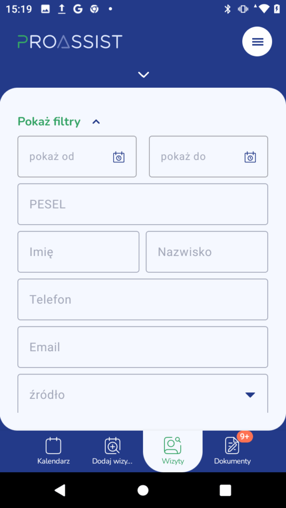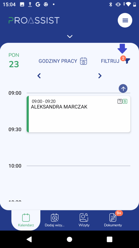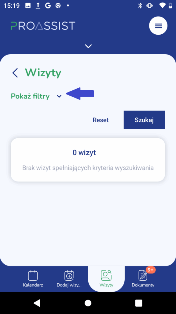 Filtrowanie wizyty w aplikacji #