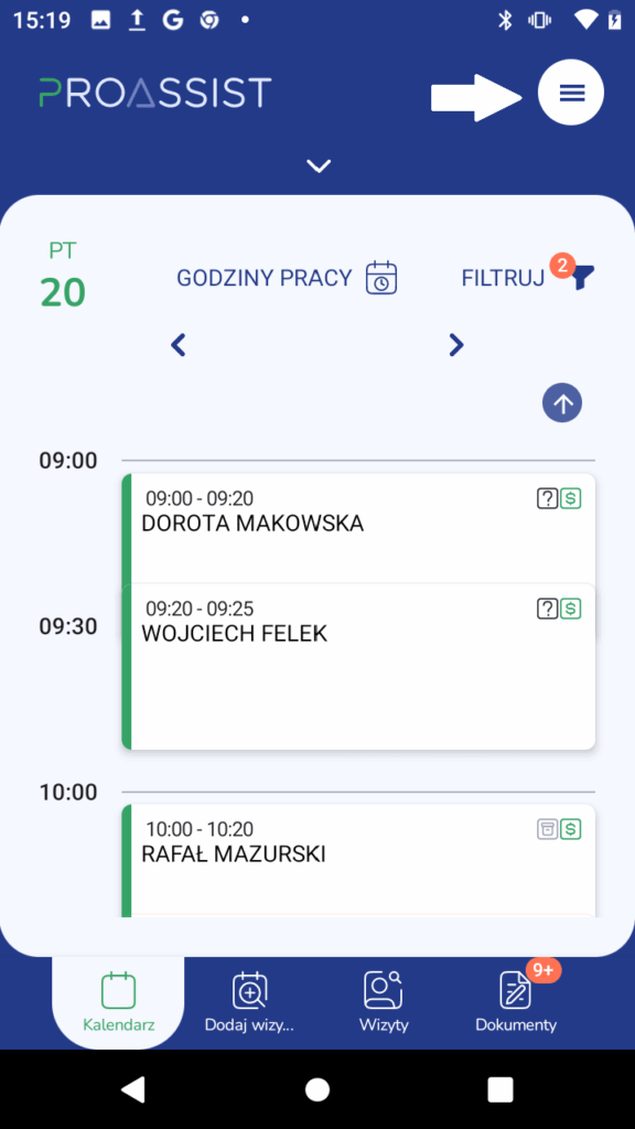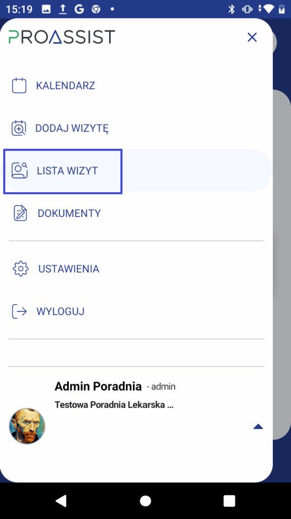 - Otwórz menu główne i wybierz „Lista wizyt”.