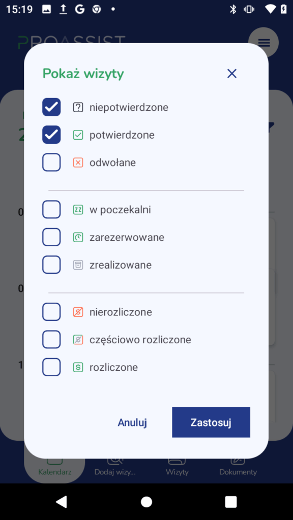 3. Wyświetli się okno filtrowania — zaznacz, które wizyty chcesz zobaczyć (np. potwierdzone, niepotwierdzone, odwołane).