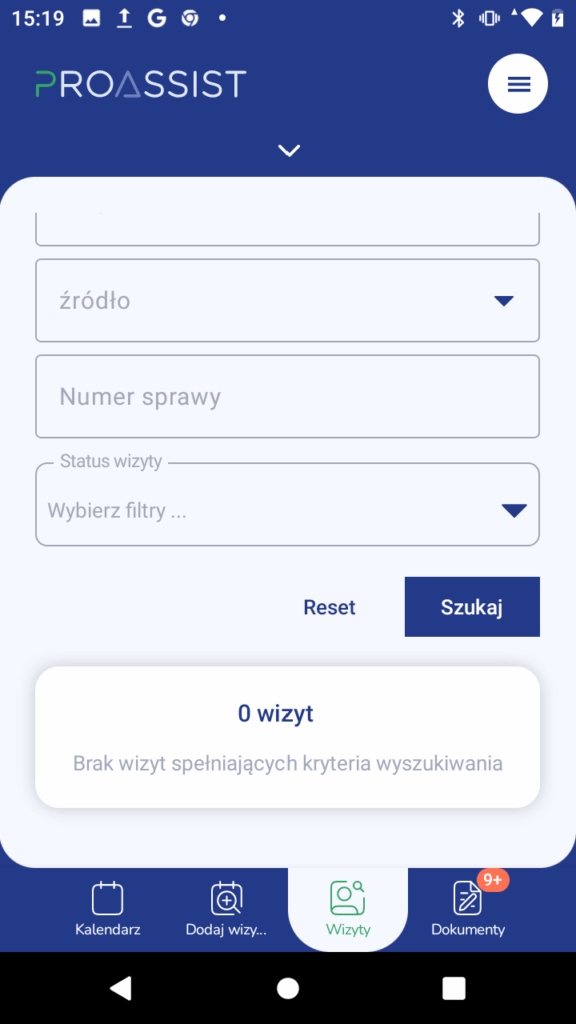 5. Kliknij „Szukaj”, aby wyświetlić wizyty zgodne z wybranymi filtrami.
