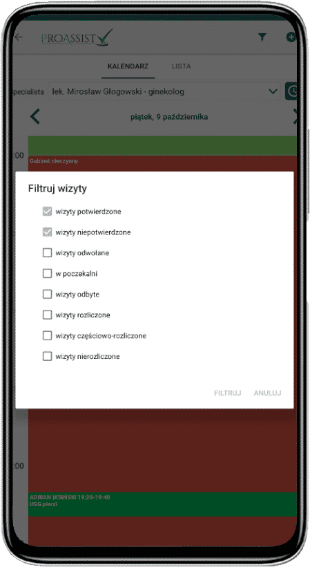 Aby znaleźć wizyty w zależności od jej statusu dotknij ikonki lejka w prawym górnym rogu ekranu głównego aplikacji. W tym momencie wyświetli się okienko, w którym możesz zaznaczyć, które wizyty chcesz zobaczyć (wizyty potwierdzone, niepotwierdzone, odwołane itd). Następnie kliknij FILTRUJ. Co ważne filtr, który ustawisz nie znika automatycznie, można go zmienić tylko ręcznie.