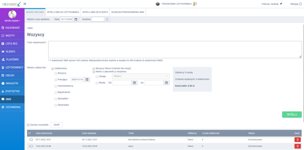 Marketing SMS jest jedną z funkcji Proassist, która odpowiada za wysyłanie SMSów do wybranej grupy pacjentów. Celem tej zbiorczej wiadomości jest przekazanie informacji dotyczących zmiany lokalizacji placówek, akcji marketingowych lub złożenie życzeń świątecznych.
