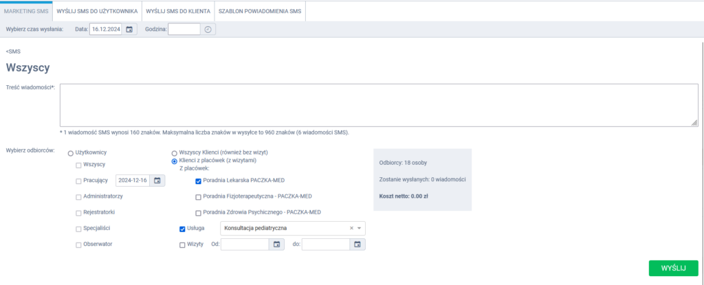 – pacjenci zapisani na konkretną usługę (gdy np. chcesz poinformować o zmianie ceny danej usługi lub promocji dot. usługi) -> Klienci z placówek (z wizytami) + dodatkowo zaznacz checkbox Usługa