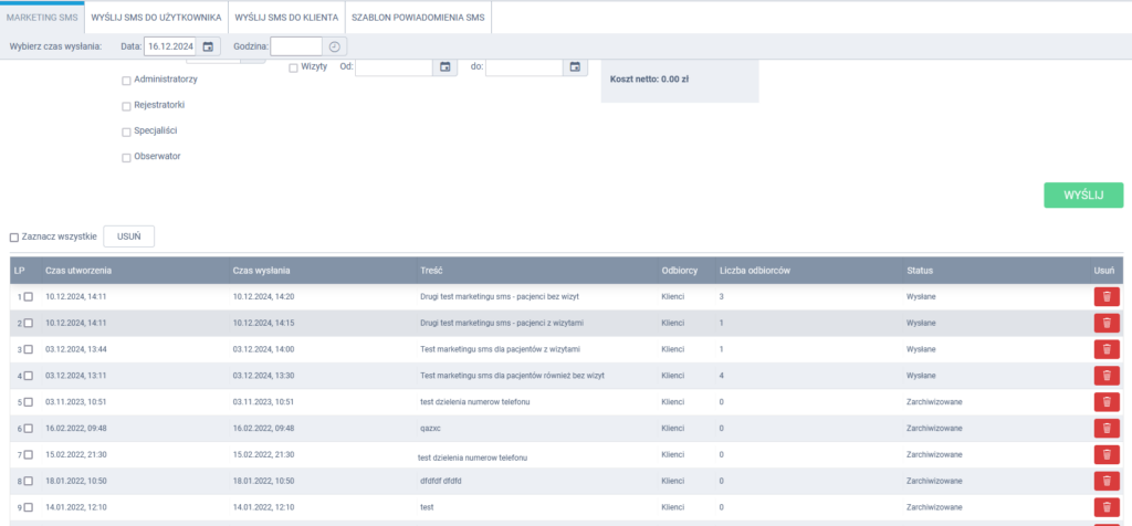 – pacjenci zapisani w określonym terminie, z wybranym odpowiednim statusem wizyty (gdy np. chcesz wysłać życzenia, bądź też poinformować o zmianach w gabinecie)-> Klienci z placówek (z wizytami) + dodatkowo zaznacz checkbox Wizyty