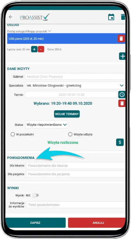 Jeśli chcesz umieścić istotne informacje dla lekarza lub pacjenta, które mogą być przydatne do przeprowadzania wizyty, wybierz konkretną wizytę z kalendarza, a następnie wypełnij pola w sekcji POWIADOMIENIA.