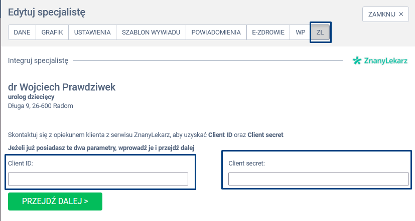 W panelu edycji specjalisty, wybierz zakładkę ZL. Wprowadź otrzymane od serwisu ZnanyLekarz.pl klucze: Client ID oraz Client secret w wyznaczone pola. Po wprowadzeniu danych przejdź do kolejnego kroku integracji za pomocą zielonej zakładki PRZEJDŹ DALEJ.
