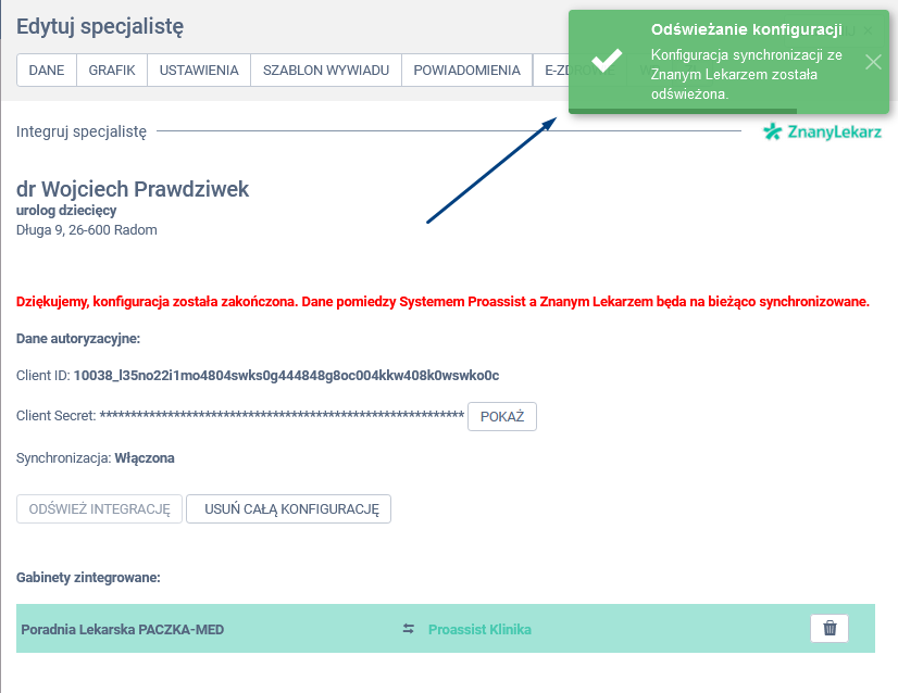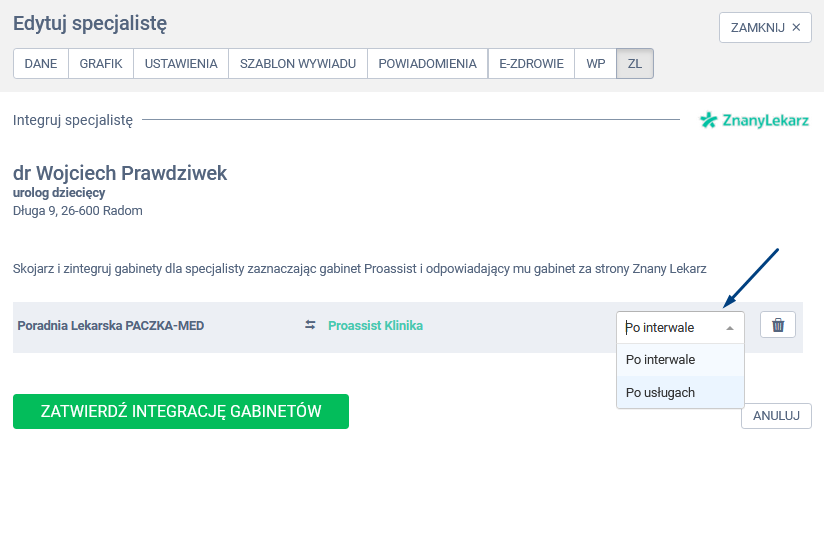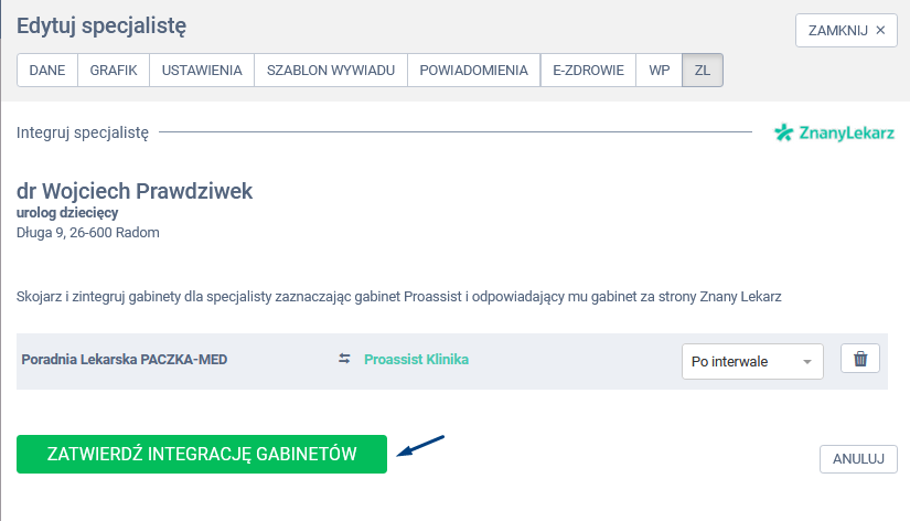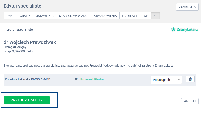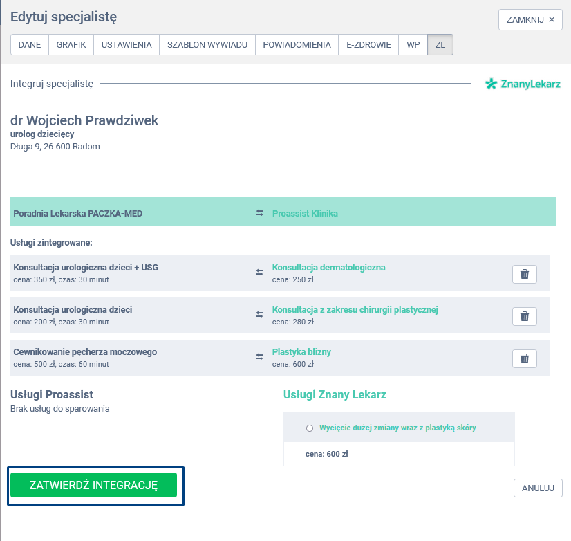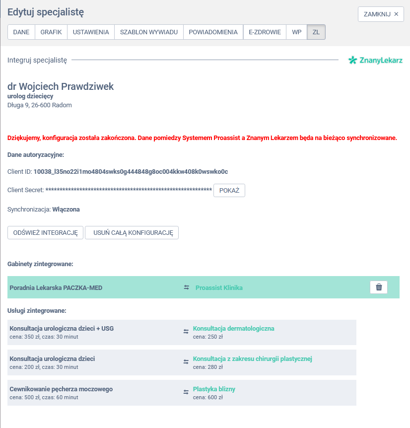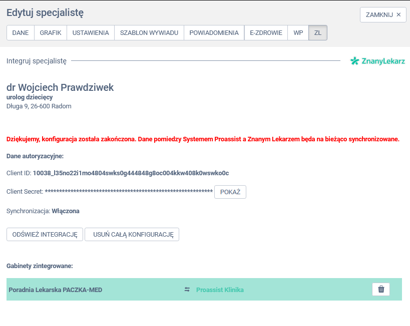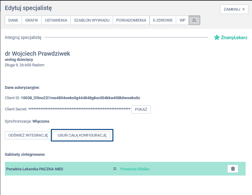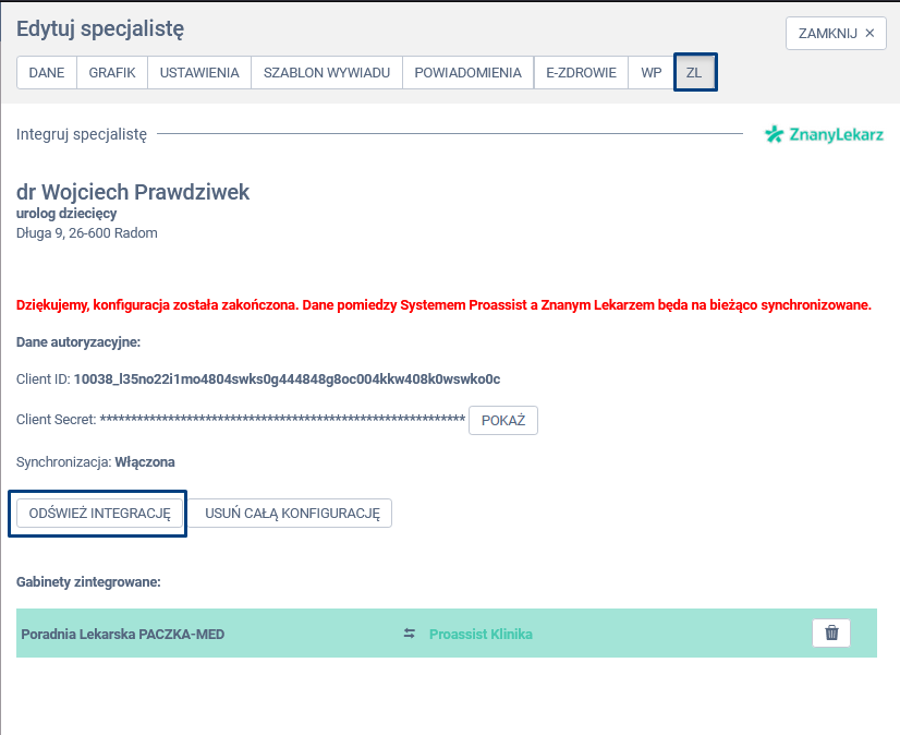 W panelu edycji specjalisty wybierz zakładkę ZL, a następnie kliknij w opcję ODŚWIEŻ INTEGRACJĘ.