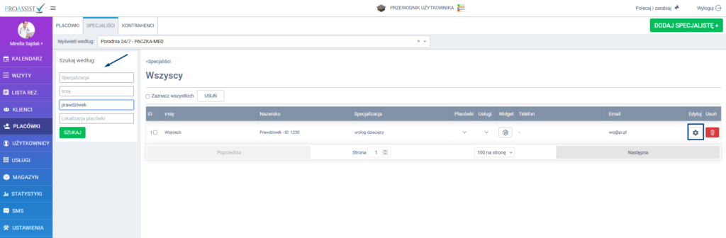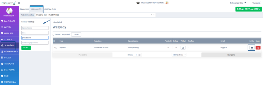 Z bocznego menu wybierz zakładkę PLACÓWKI, w kolejnym kroku wybierz zakładkę SPECJALIŚCI. Na liście specjalistów, wyszukaj odpowiednią osobę, której kalendarz chcesz zintegrować, a następnie kliknij w ikonę edycji. W celu wyszukania odpowiedniej osoby możesz skorzystać z wyszukiwarki.