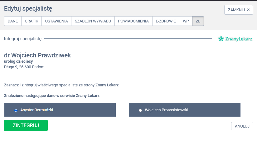 Wybierz odpowiedniego specjalistę po stronie ZnanyLekarz, a następnie kliknij w zieloną zakładkę ZINTEGRUJ, aby przejść do kolejnego kroku.