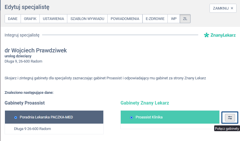 Porównaj dane gabinetów w obu systemach. Dla każdego gabinetu w Proassist zaznacz odpowiadający mu gabinet na ZnanyLekarz. Po wybraniu odpowiednich gabinetów, kliknij w ikonę „Połącz gabinety„.