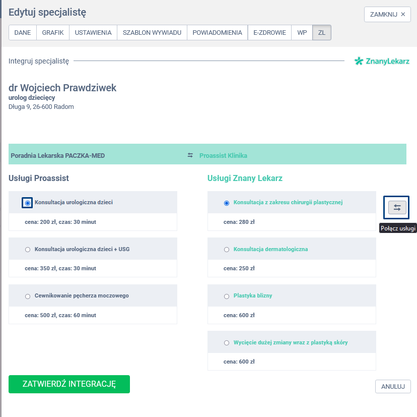 Aby zapewnić spójność między systemami, każda usługa dostępna w Proassist powinna mieć swój odpowiednik w portalu ZnanyLekarz. Dopasuj usługi 1:1, co oznacza, że każda usługa w Proassist musi być zsynchronizowana z odpowiednią usługą w ZnanyLekarz. Sparuj odpowiednią usługę Proassist z jej odpowiednikiem w ZnanyLekarz, a następnie kliknij w ikonę Połącz usługi. Powtórz czynność dla każdej usługi.