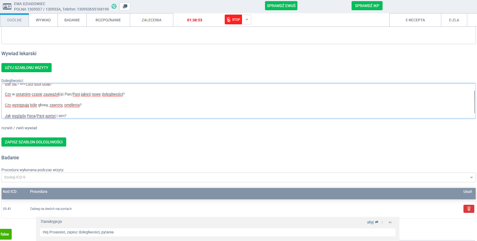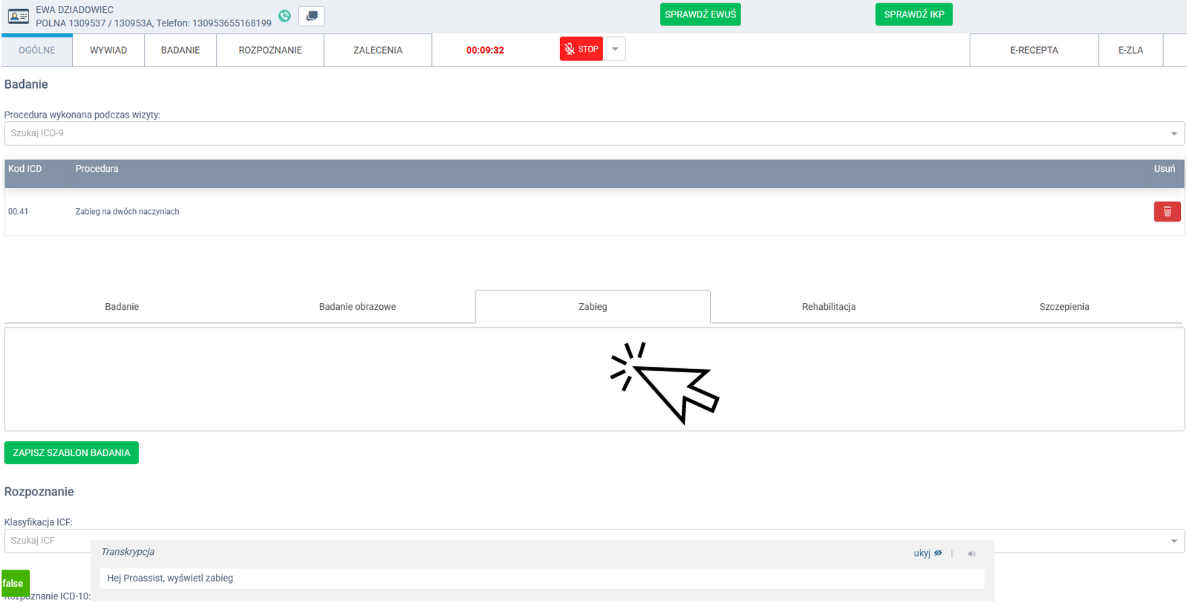 - przejście do sekcji zabieg: “Hej Proassist, wyświetl zabieg”