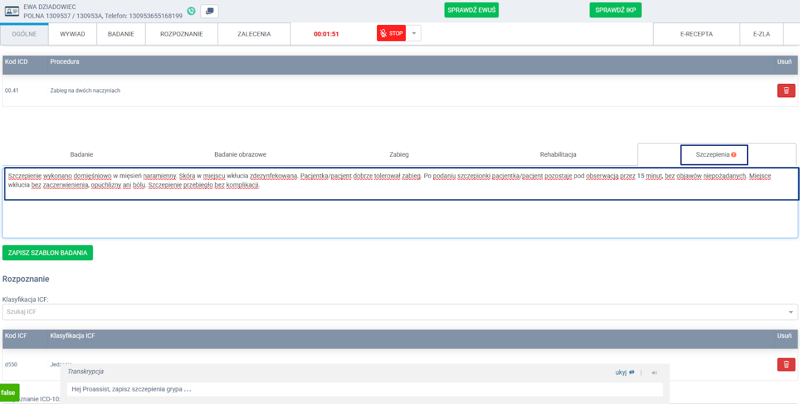 “Okej Proassist, wstaw szczepienia: wykonano szczepienie przeciw grypie. Miejsce wkłucia bez zaczerwienienia, opuchlizny czy bólu. Pacjent w dobrym stanie ogólnym.”