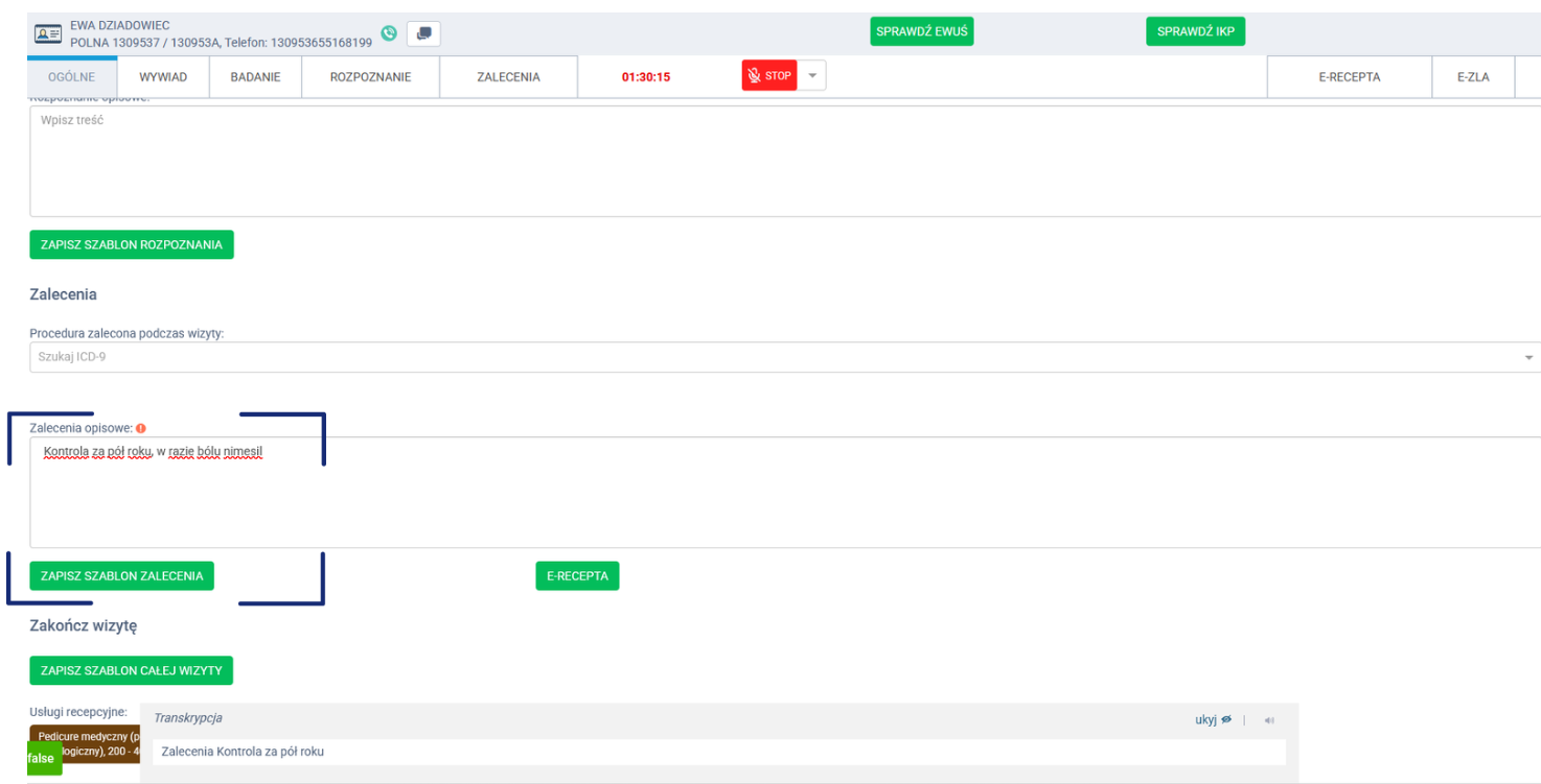 System automatycznie wstawi treść przypisaną do wskazanego szablonu w sekcji „Zalecenia”.