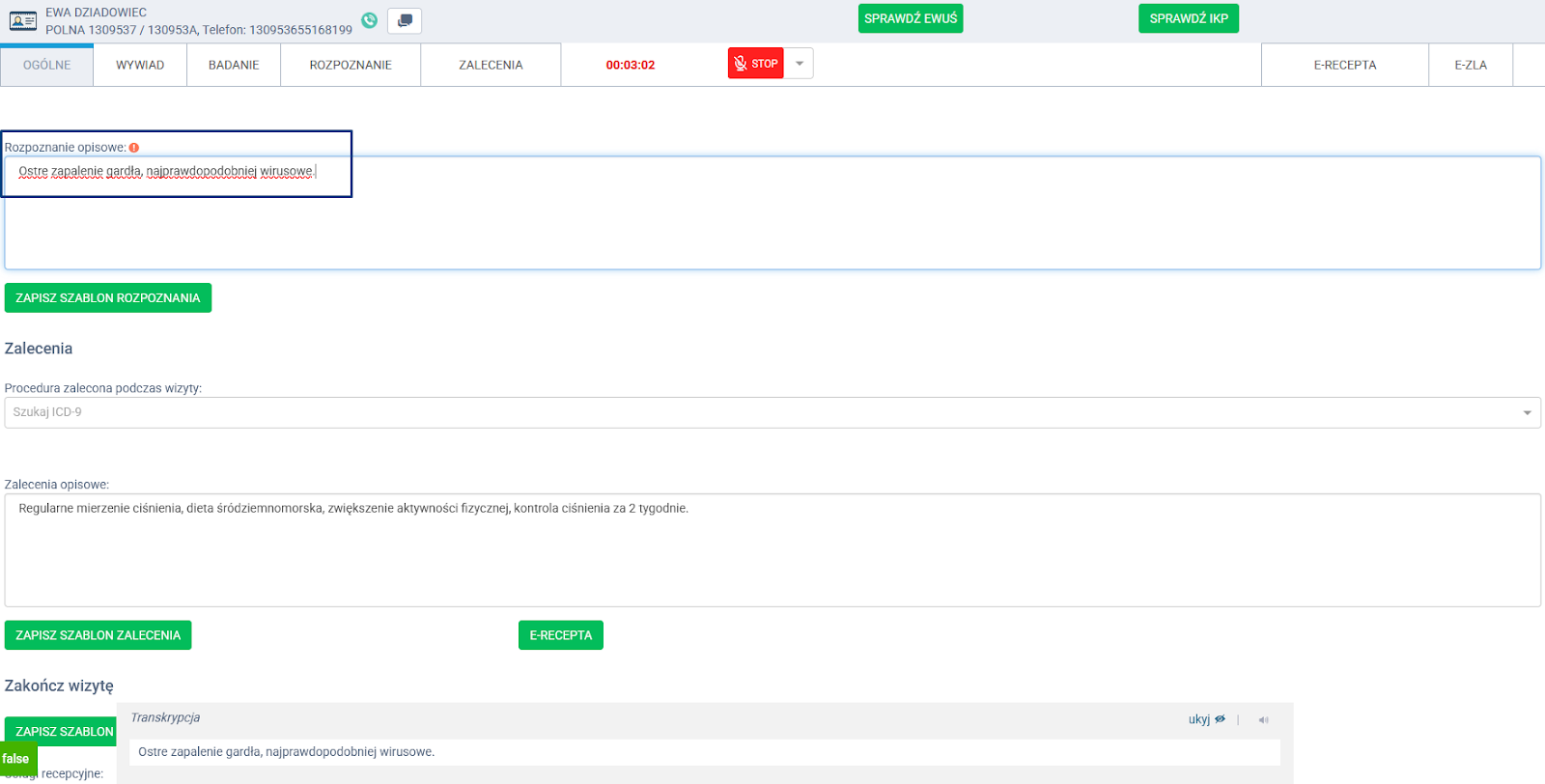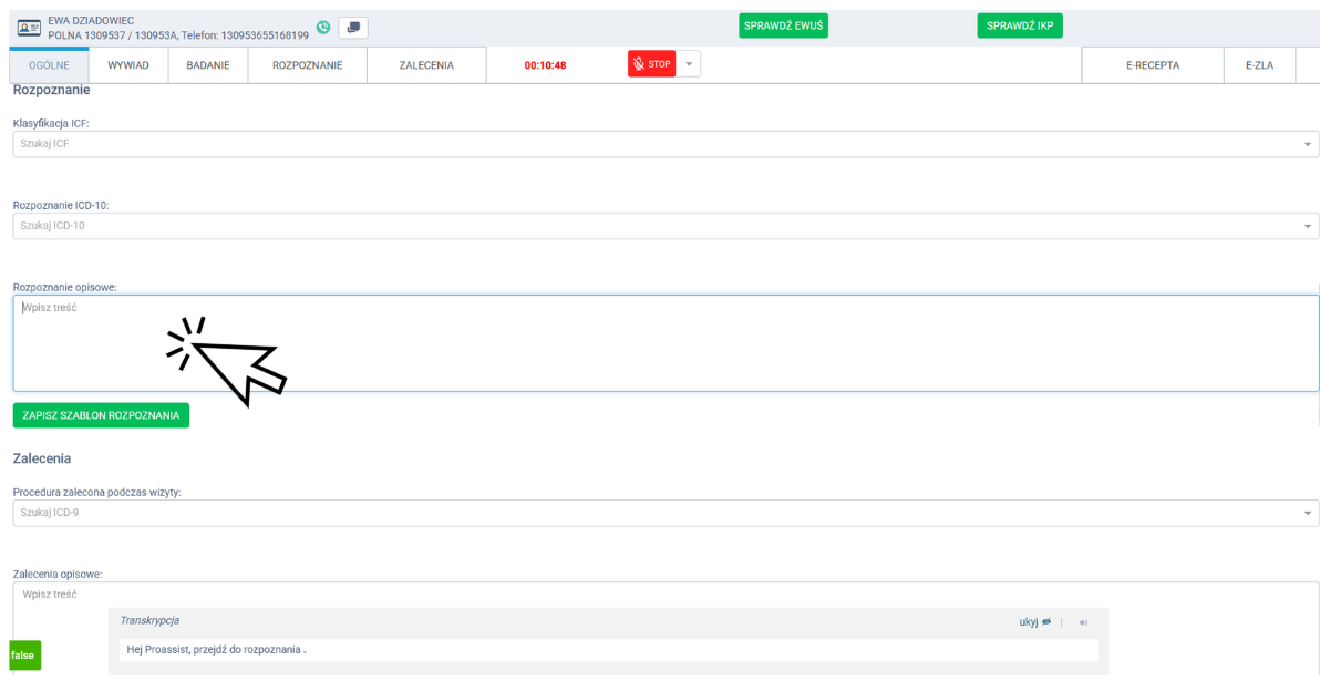System rozpozna frazę „wprowadź rozpoznanie” i umieści dyktowaną treść w odpowiednim miejscu formularza.