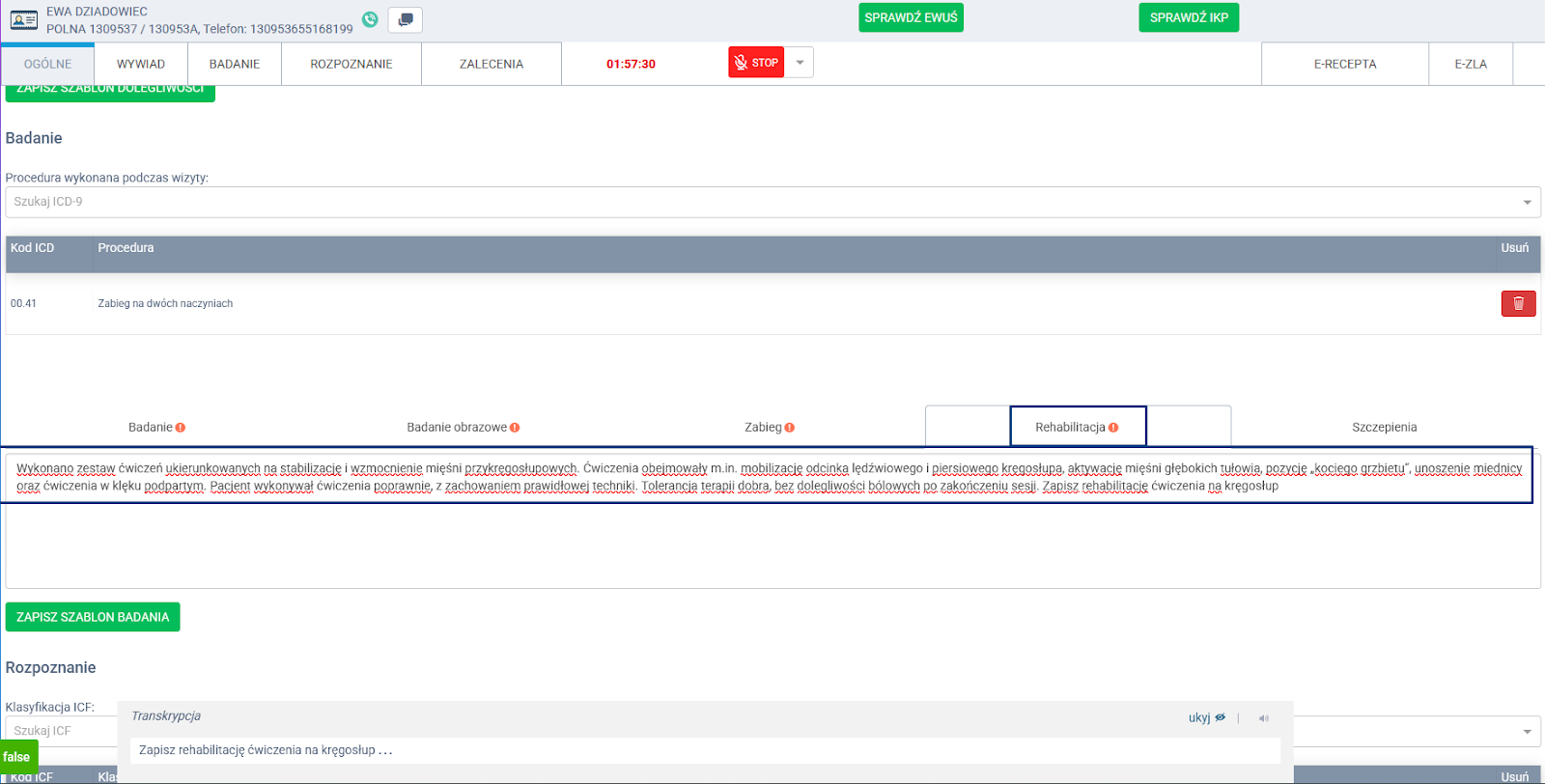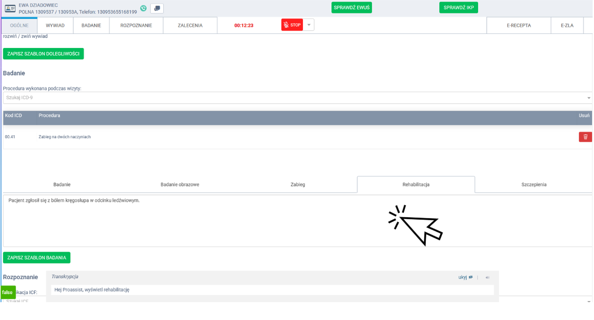 System rozpozna frazę „wprowadź rehabilitację” i umieści dyktowaną treść w odpowiednim miejscu formularza.