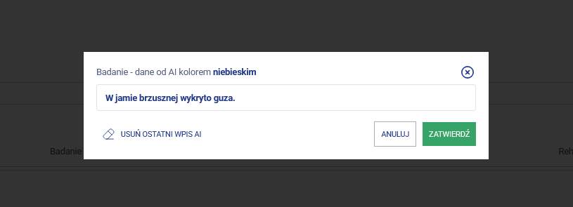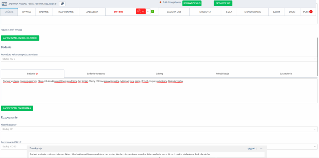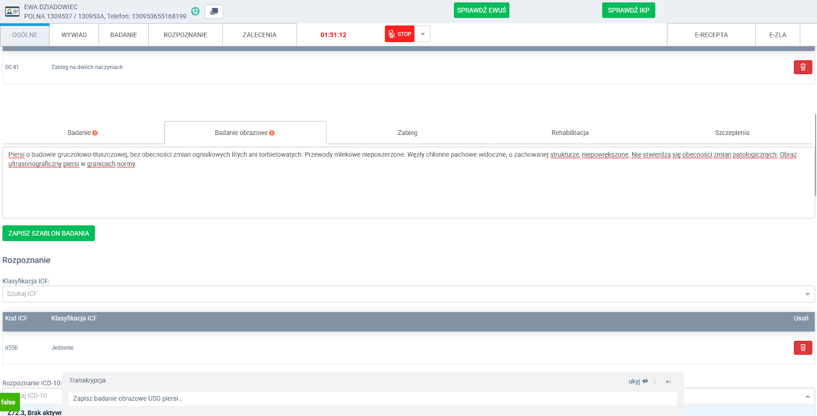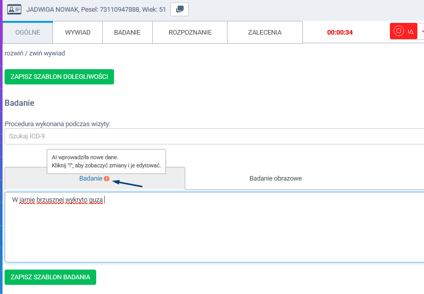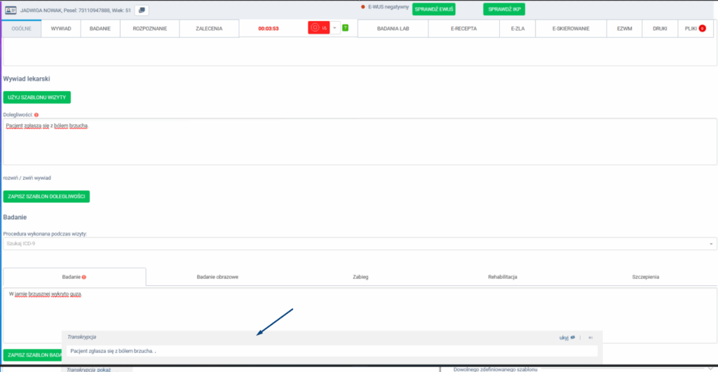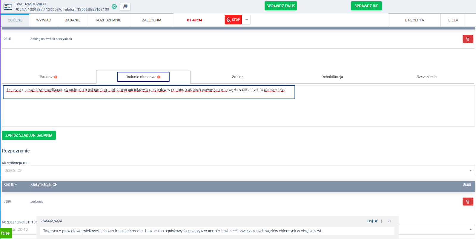 System rozpozna frazę „pisz badanie” i umieści dyktowaną treść w odpowiednim miejscu formularza.
