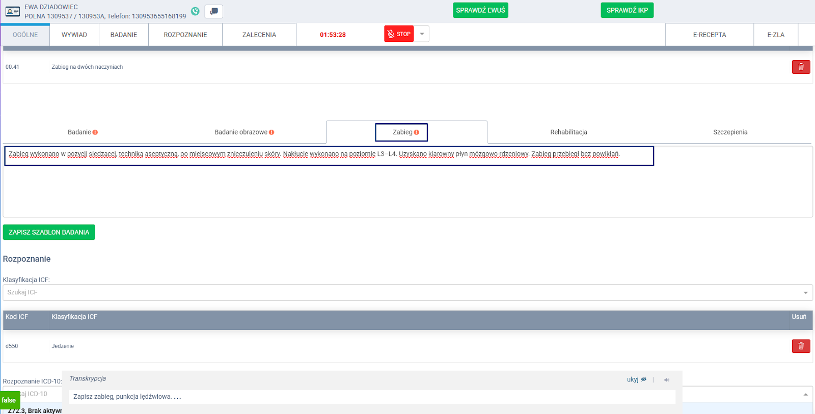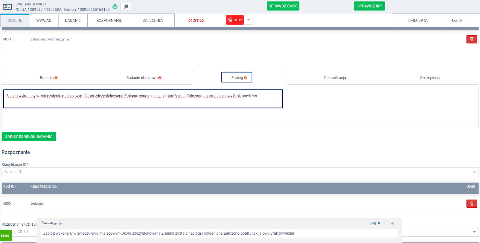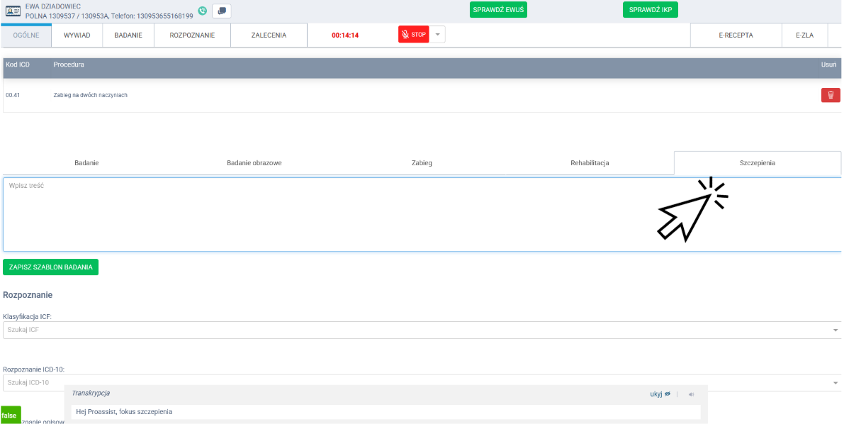 System rozpozna frazę „pisz zabieg” i umieści dyktowaną treść w odpowiednim miejscu formularza.