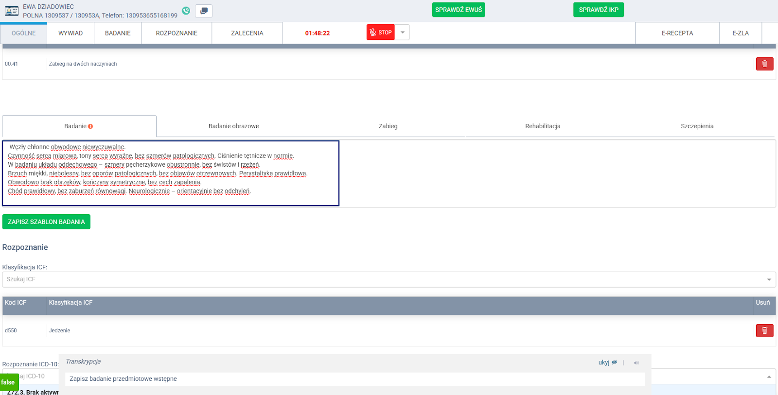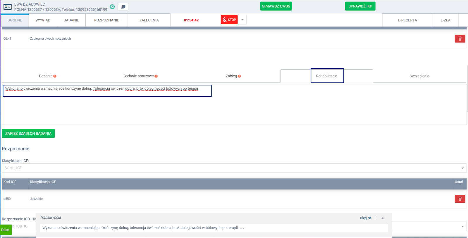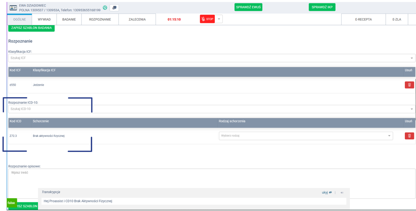 - Dodanie kodu ICF w sekcji Rozpoznanie: