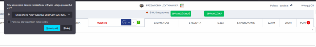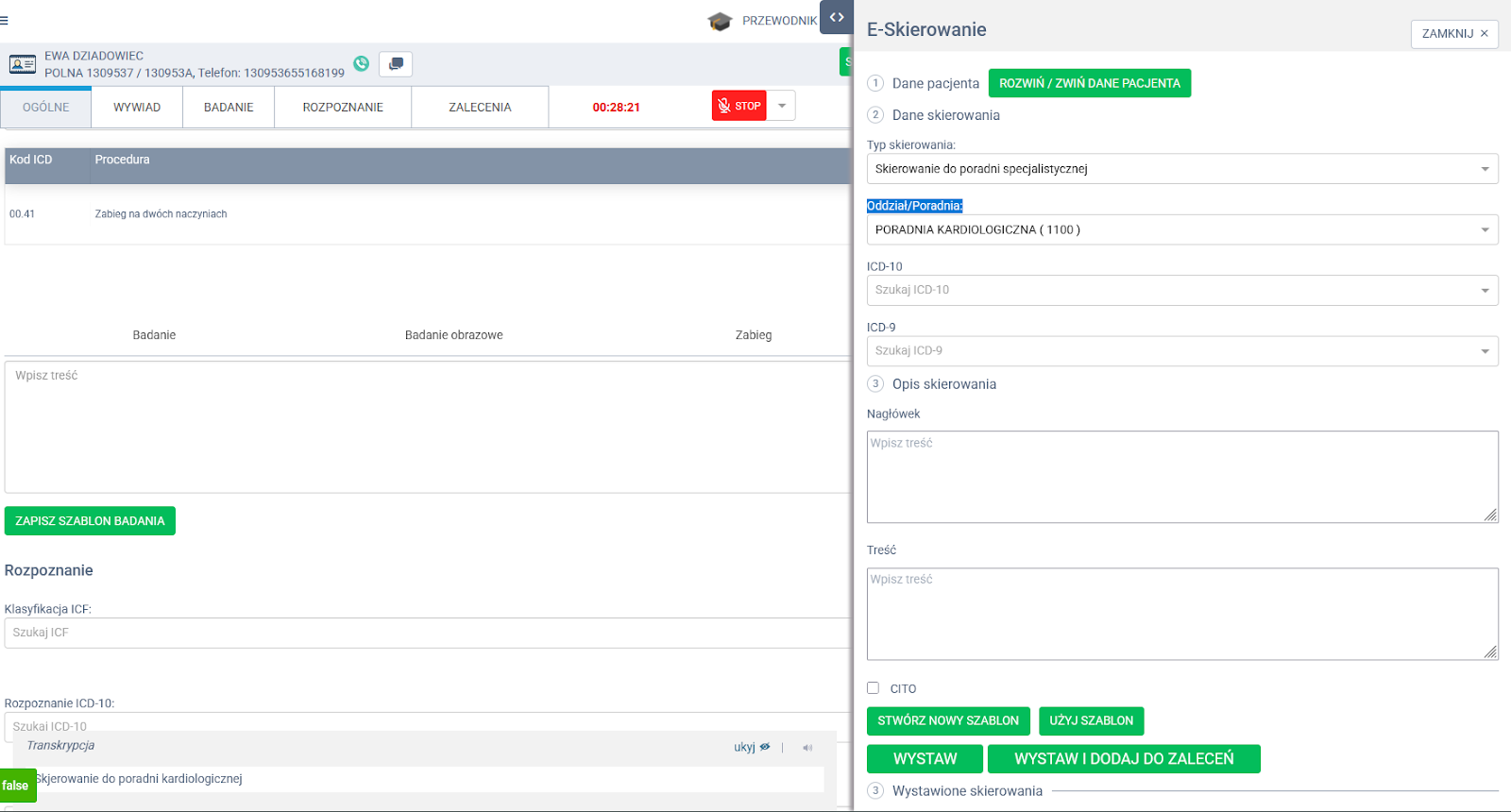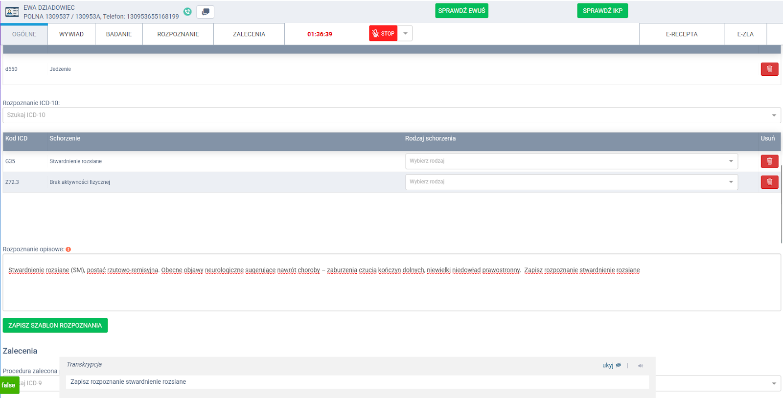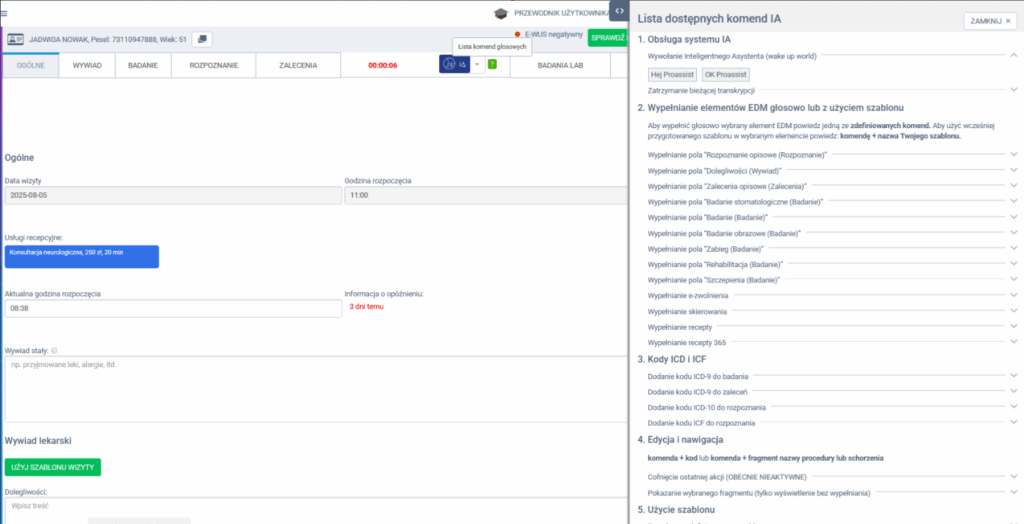 Po jej aktywacji ikona zmieni kolor na czerwony – oznacza to, że system rozpoczął nasłuchiwanie i będzie na bieżąco transkrybował Twoją mowę na tekst. Podczas aktywnego nasłuchiwania możesz nie tylko dyktować treść, ale także korzystać z komend głosowych, które pozwalają nawigować po formularzu EDM, przechodzić między sekcjami czy wstawiać szablony.