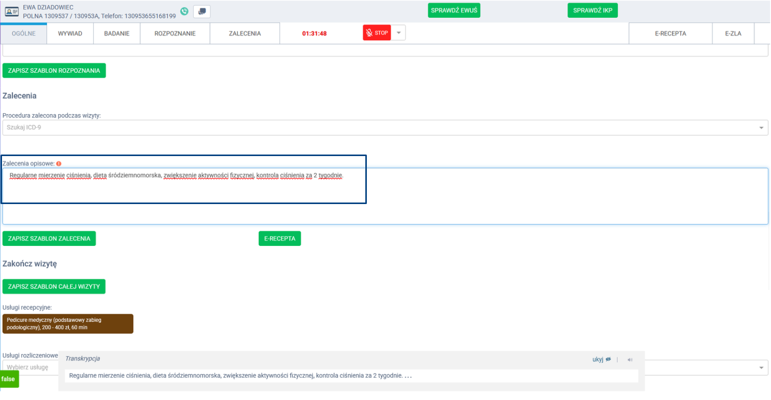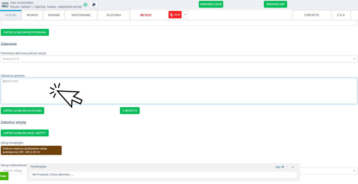 System rozpozna frazę „wprowadź zalecenia” i umieści dyktowaną treść w odpowiednim miejscu formularza.