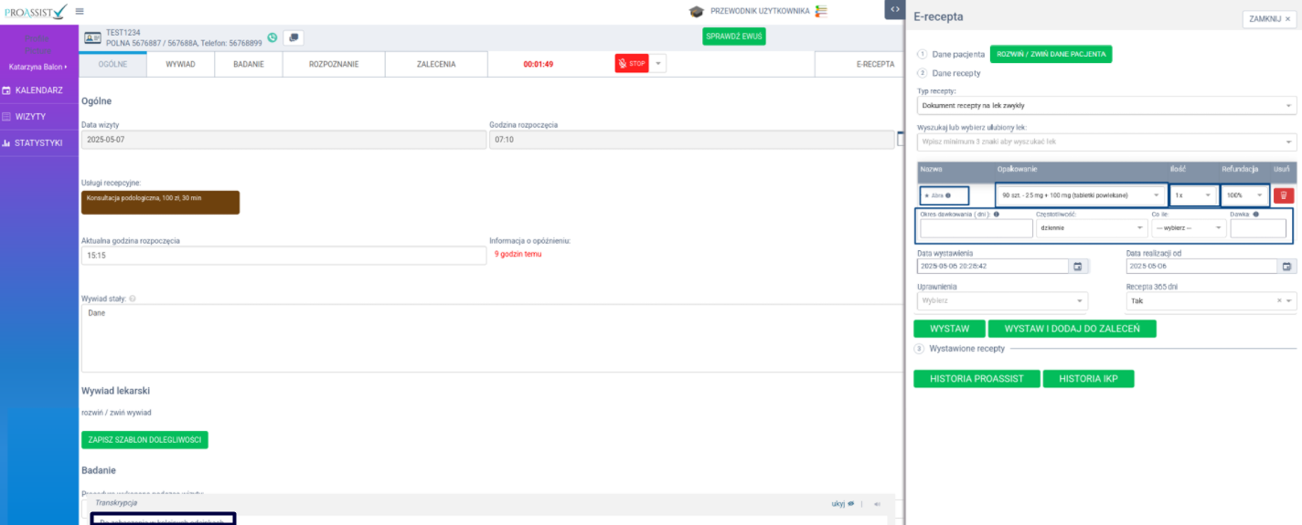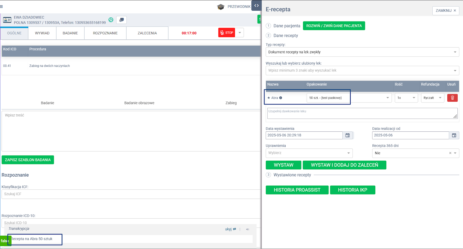 „Hej Proassist, dołącz receptę [pauza] Recepta na Abra. Proszę przyjmować dwa razy dziennie po 1 tabletce przez tydzień”