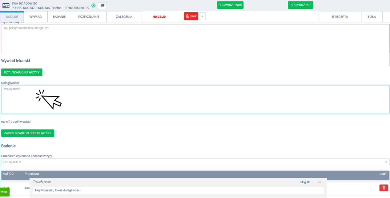 Analogicznie jak w przypadku pola „Dolegliwości”, po zakończeniu dyktowania możesz powiedzieć: „Hej Proassist, stop”, aby zakończyć nasłuchiwanie, lub wypowiedzieć kolejną komendę, by kontynuować wypełnianie dokumentacji.