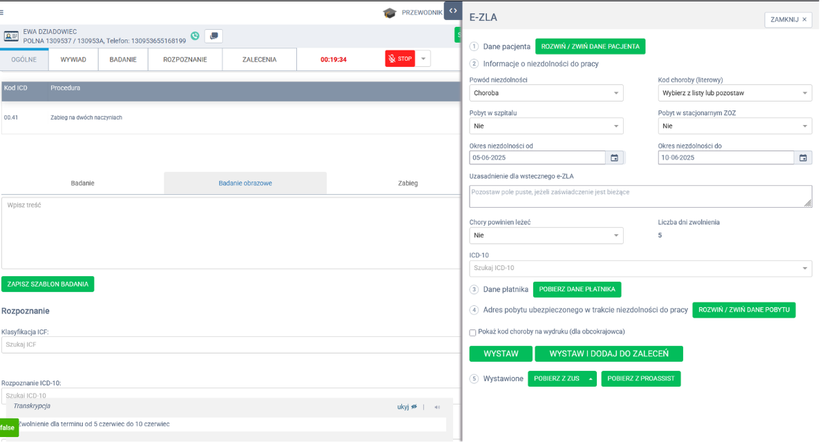 - Dodanie kodu ICD-10 w sekcji Rozpoznanie:
