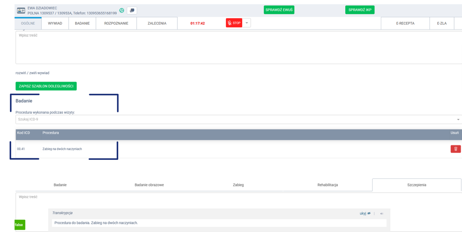 - Dodanie kodu ICD-9 w sekcji Badanie (procedura wykonana):