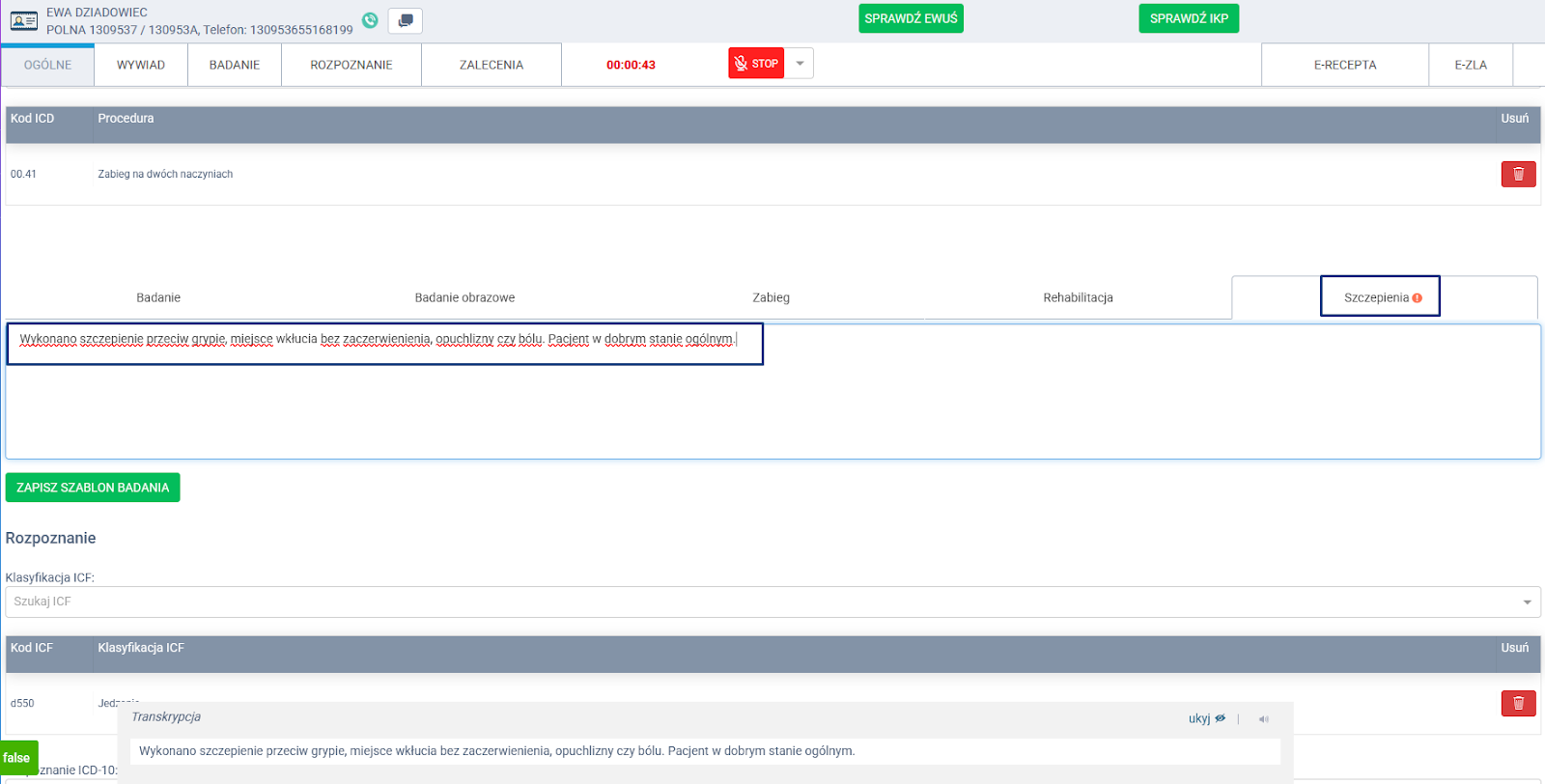 System rozpozna frazę „wstaw szczepienia” i umieści dyktowaną treść w odpowiednim miejscu formularza.