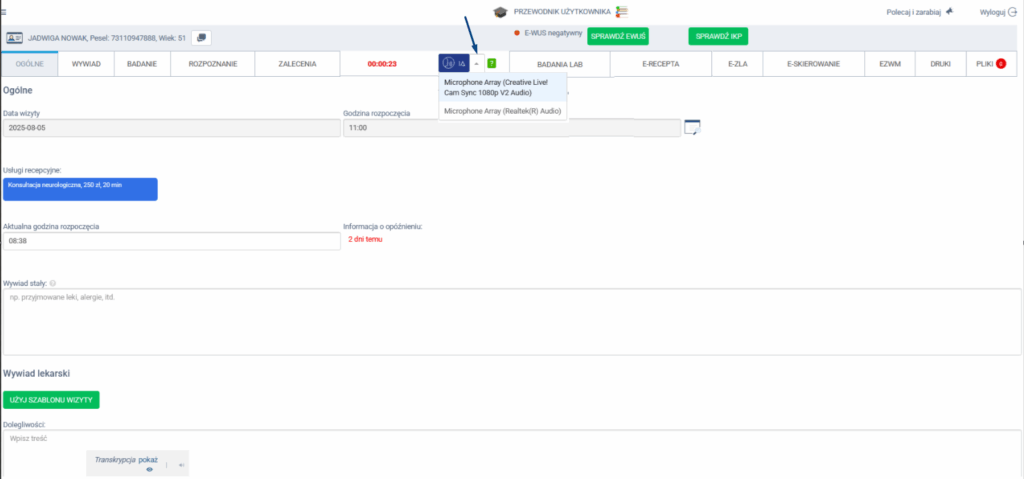 Aby uruchomić Inteligentnego Asystenta Głosowego należy w oknie przeprowadzania wizyty, kliknąć w przycisk uruchamiający rozpoznawanie mowy. Przed rozpoczęciem głosowego wypełniania dokumentacji medycznej należy upewnić się, że system ma dostęp do mikrofonu. W pierwszej kolejności wybierz odpowiednie urządzenie wejściowe z listy dostępnych mikrofonów – w tym celu kliknij ikonę trójkąta znajdującą obok ikony Asystenta.