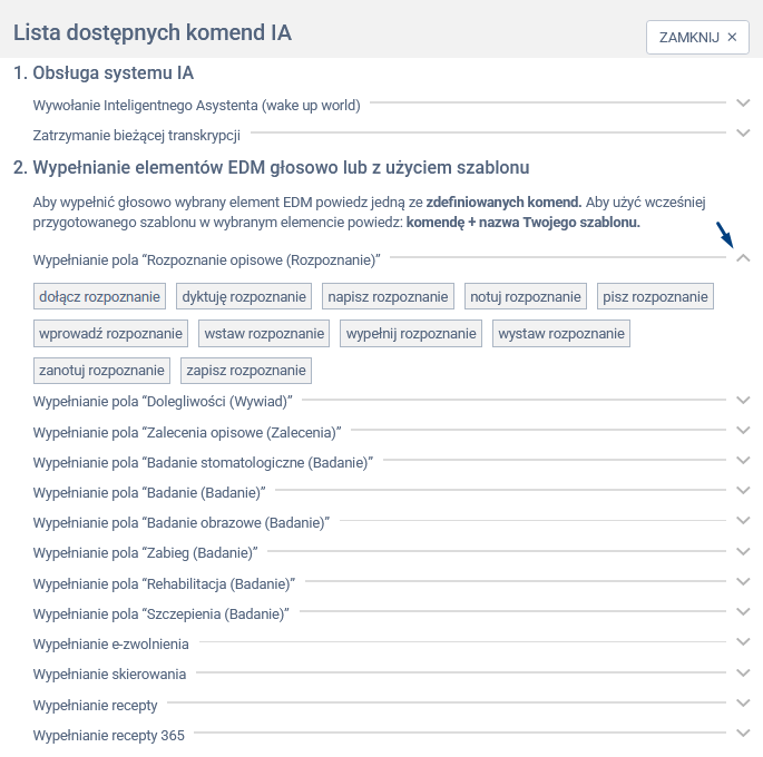 Lista jest podzielona na kategorie odpowiadające konkretnym akcjom w systemie. Przy każdej kategorii znajduje się przycisk „V”, który po rozwinięciu prezentuje szczegółowe komendy przypisane do danej czynności, np. jak uzupełnić badanie, wprowadzić zalecenia czy wystawić receptę. Dzięki temu można szybko odnaleźć właściwe polecenia i efektywnie korzystać z asystenta.