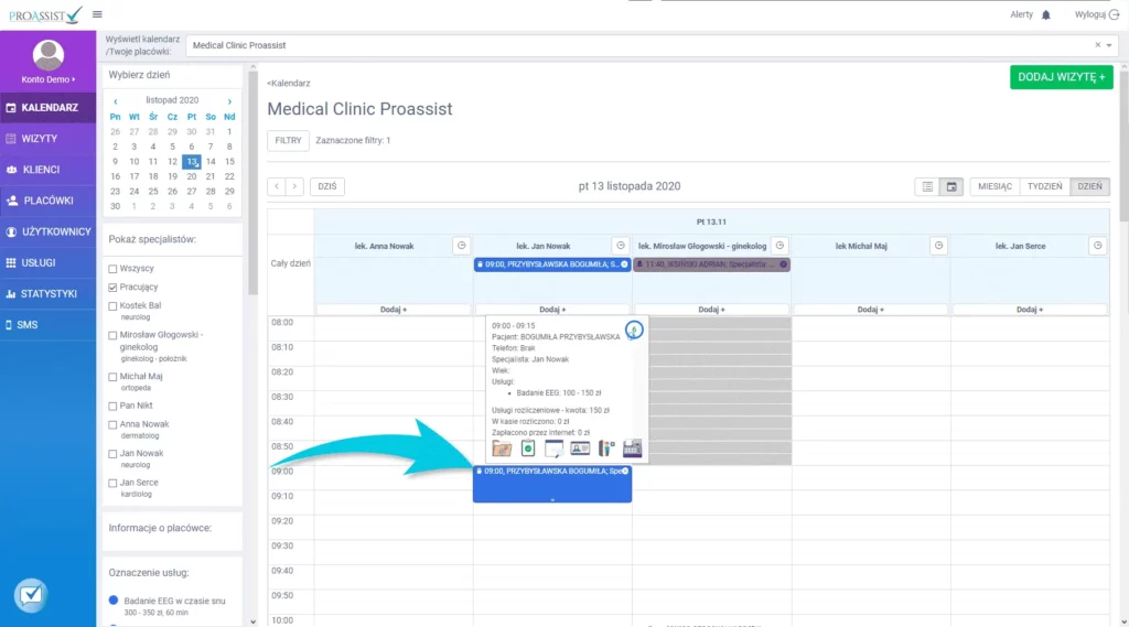 Pacjent może w prosty sposób odwołać wizytę przez wiadomość SMS. Każda treść wiadomości na końcu zawiera informację: Jeśli chcesz anulować wizytę odpisz: 1111111 – przykładowy kod, który pacjent wpisuje w odpowiedź na wiadomość, jeśli chce odwołać wizytę. Po odesłaniu tego kodu, wizyta zostanie natychmiastowo anulowana i trafi do sekcji „Wizyty odwołane” w systemie.