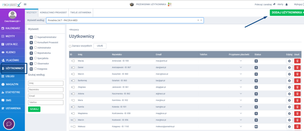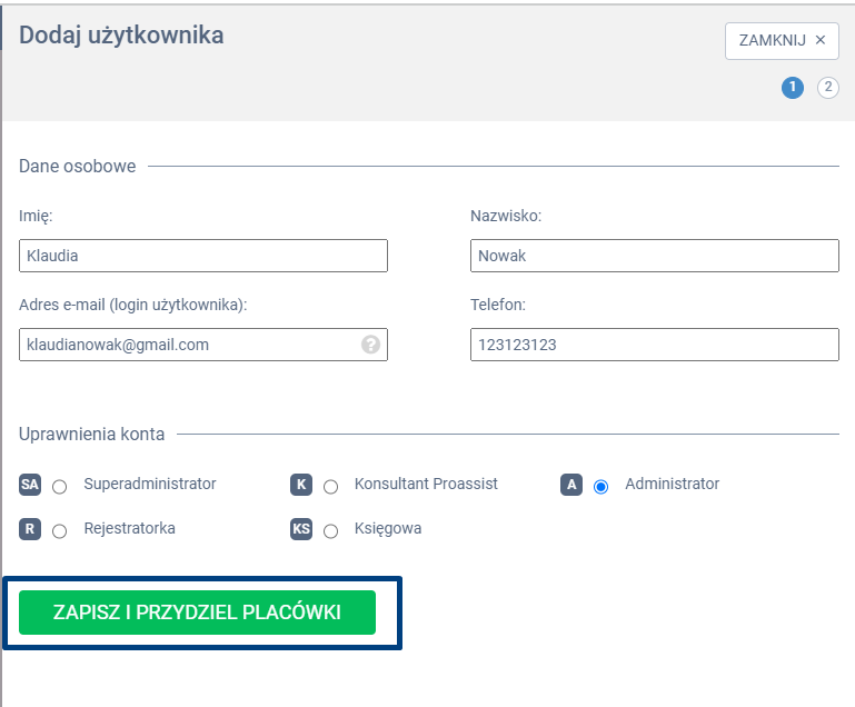 W panelu wyskakującym z prawej strony uzupełnij dane osobowe użytkownika, a następnie zaznacz odpowiedni checkbox w zależności od tego, jakie uprawnienia chcesz nadać użytkownikowi. By przejść do kolejnego kroku kliknij w zieloną zakładkę ZAPISZ I PRZYDZIEL PLACÓWKI.