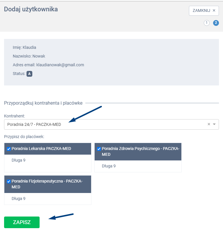 Wybierz odpowiedniego kontrahenta oraz placówki do których dana osoba ma mieć dostęp. Zapisz dane zieloną zakładką ZAPISZ.