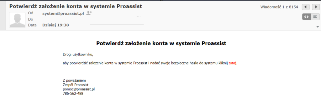 Na wskazany e-mail zostanie wysłana wiadomość z prośbą o weryfikację konta. Dokonanie weryfikacji konta jest niezbędne, aby użytkownik mógł zalogować się do systemu Proassist. Czas na weryfikację konta wynosi: 7 dni.