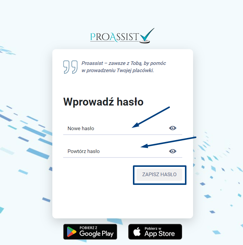 Po kliknięciu w opcję „tutaj” system wyświetli okno w którym dana osoba nada hasło do konta. Wprowadzone hasło należy zapisać poprzez kliknięcie w zakładkę ZAPISZ HASŁO.