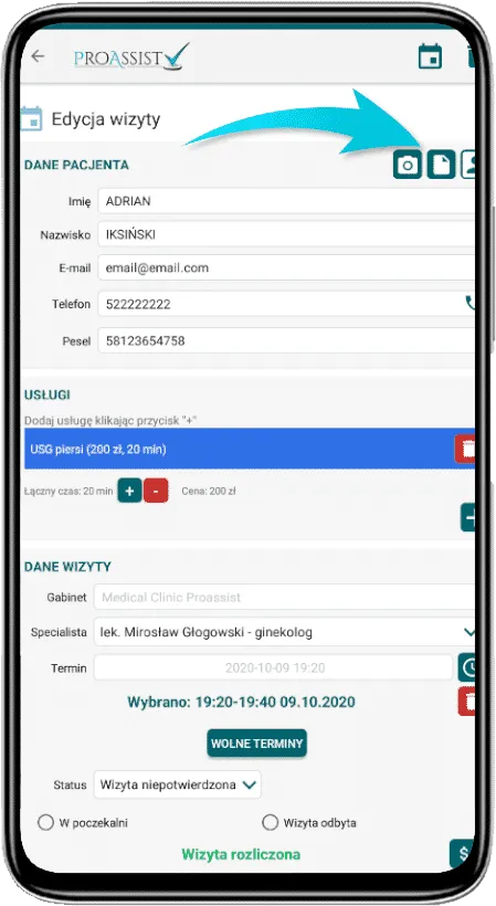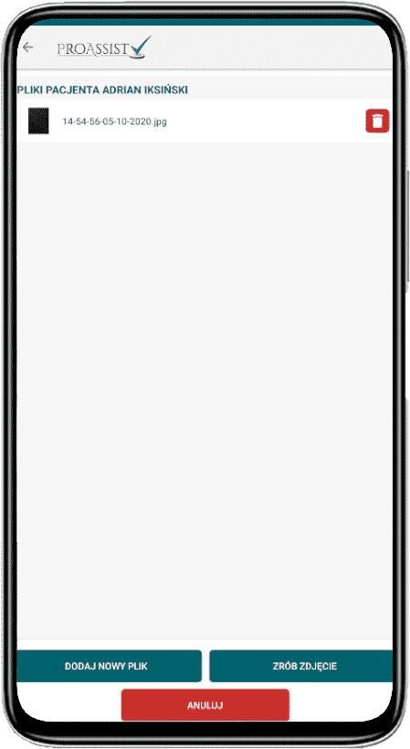 Aby dodać zdjęcie wybierz konkretną wizytę w kalendarzu, a następnie kliknij ikonkę karty (środkowa ikona) w prawym górnym rogu. Wybierz odpowiednią zakładkę: DODAJ NOWY PLIK (jeśli chcesz wybrać plik z tych, które znajdują się w pamięci Twojego telefonu), lub ZRÓB ZDJĘCIE, jeśli chcesz wstawić zdjęcie bezpośrednio po jego zrobieniu. Zdjęcie możesz zrobić także klikając w ikonkę aparatu (ostatnia ikonka) w prawym górnym rogu okna do edycji wizyty.