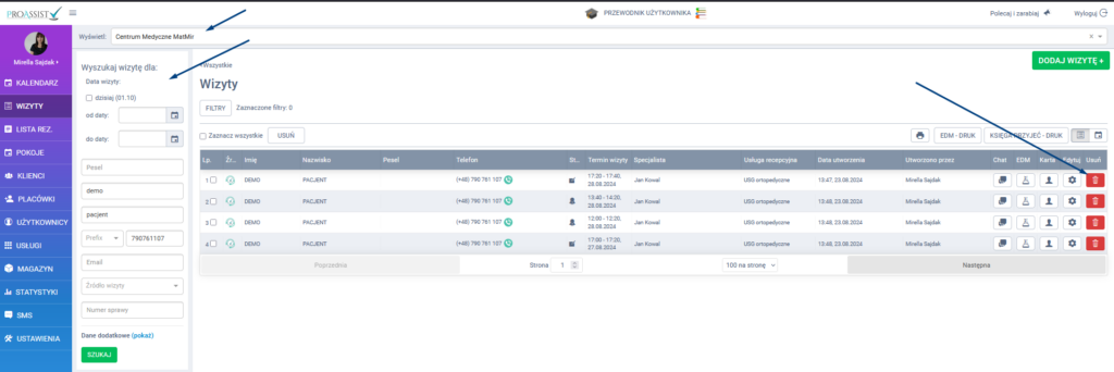 2. Wybierz zakładkę WIZYTY z bocznego menu, a następnie wyszukaj odpowiednią wizytę. W tym celu wpisz dane pacjenta w sekcji „Wyszukaj wizyty dla”. W tym momencie wyświetli się lista wizyt wyszukanego pacjenta. Kliknij ikonkę kosza „Usuń” przy konkretnej wizycie na liście.