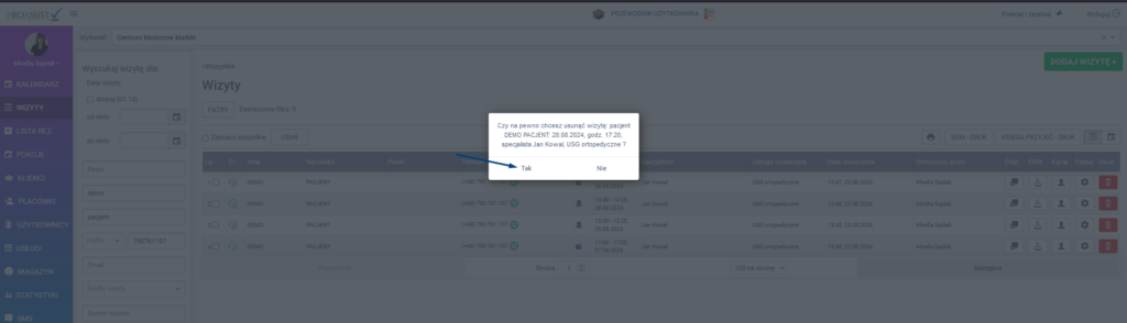 System wyświetli podsumowanie usuwania wizyty, zawierające szczegóły dotyczące terminu i specjalisty. Jeżeli nadal podtrzymujesz decyzję o usunięciu wizyty, kliknij przycisk „TAK”.