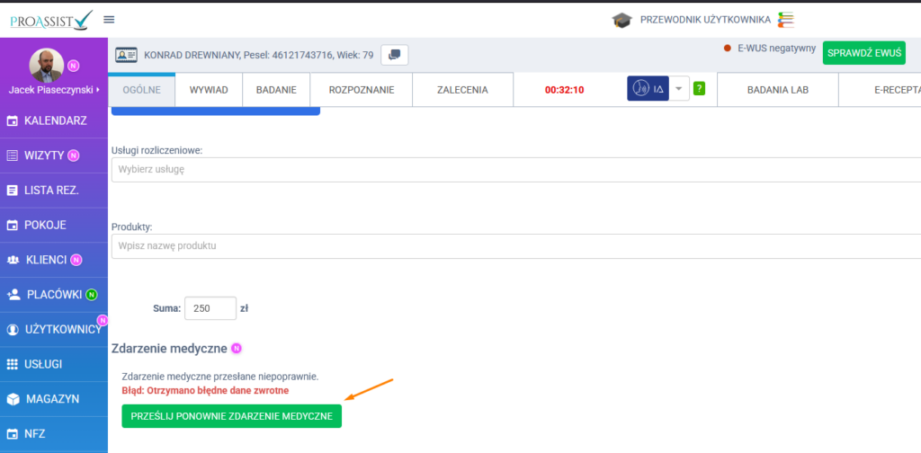 Jeżeli Zdarzenie Medyczne nie zostało wysłane prawidłowo, możesz je od razu przesłać ponownie. W tym celu należy wejść w okno przeprowadzania wizyty pacjenta i przewinąć ekran w dół do sekcji „Zdarzenie Medyczne”. W tej sekcji system pokaże informację o nieudanej wysyłce oraz powód, dla którego ZM nie zostało przesłane. Aby wysłać zdarzenie ponownie, należy kliknąć przycisk „Prześlij ponownie zdarzenie medyczne”.