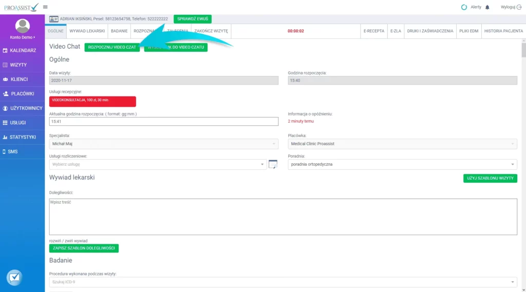 Aby rozpocząć wideorozmowę z pacjentem kliknij zielony przycisk ROZPOCZNIJ VIDEOCHAT. Zezwól przeglądarce na udostępnienie kamery i mikrofonu aby prawidłowo przeprowadzić wideorozmowę.