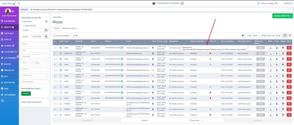 - 🔴 Niepoprawne – EDM nie zostało przesłane; po najechaniu kursorem pojawia się opis błędu, który należy sprawdzić (np. dane pacjenta lub ustawienia specjalisty).