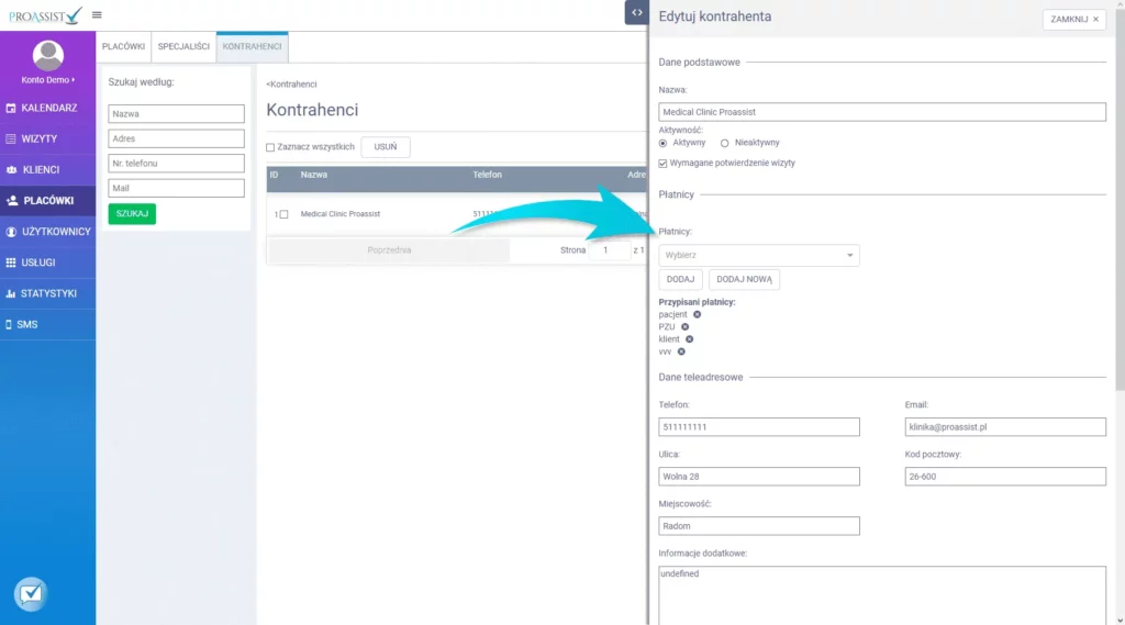 Aby ustawić nazwy płatników, wybierz PLACÓWKI z bocznego menu, a następnie górną zakładkę KONTRAHENCI. Kliknij ikonkę edycji przy konkretnym kontrahencie, a następnie w sekcji Płatnicy wybierz z listy i kliknij DODAJ, lub kliknij przycisk DODAJ NOWĄ, następnie wpr