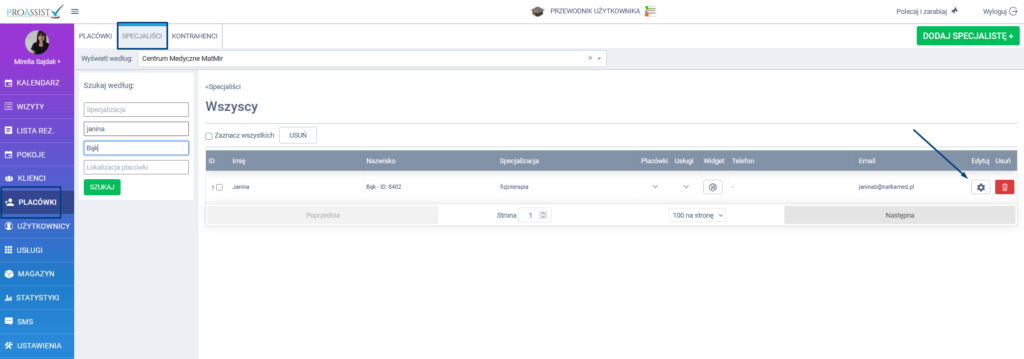 - Przejdź do zakładki Placówki w bocznym menu, a następnie wybierz Specjaliści.